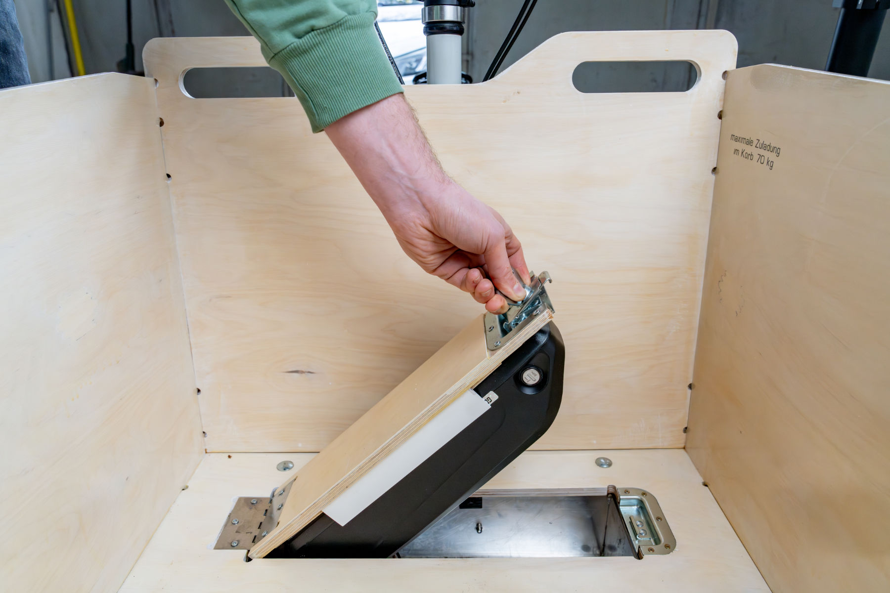 1-2 abnehmbare Akkus, unter dem Korb verschließbar verstaut.